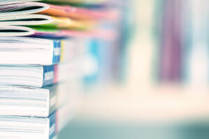 Close,Up,Edge,Of,Colorful,Magazine,Stacking,With,Blurry,Bookshelf